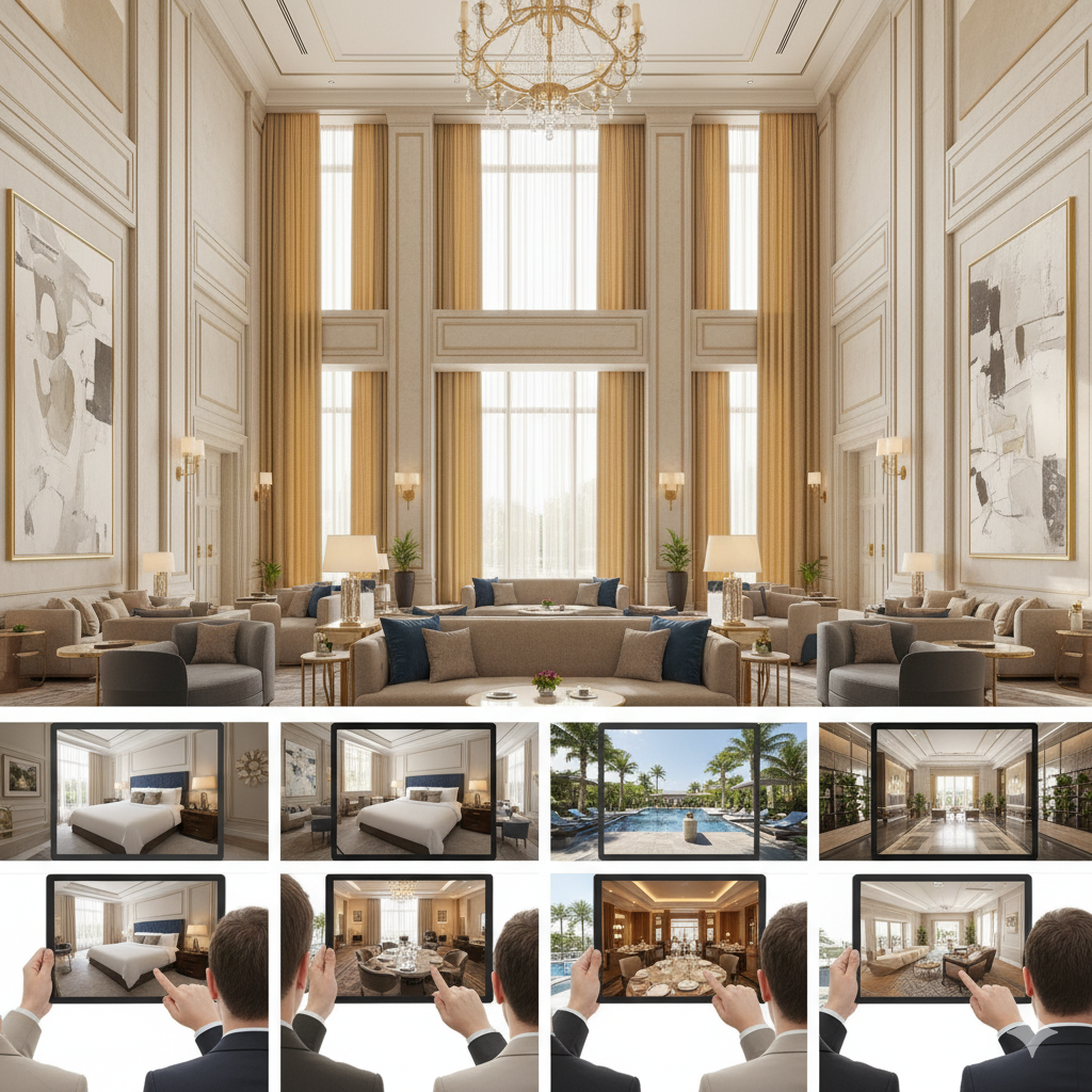 Transforma la experiencia de exhibición de productos para que el cliente pueda apreciar materiales y texturas como si estuviera allí físicamente. En lugar de fotos estáticas, permite recorrer el espacio y presentarte de una forma innovadora.
